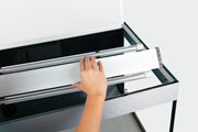 - The handle-free cabinet doors with push-to-open function ensure a clear design and the aluminium strips on the aquarium cover up unattractive edges.